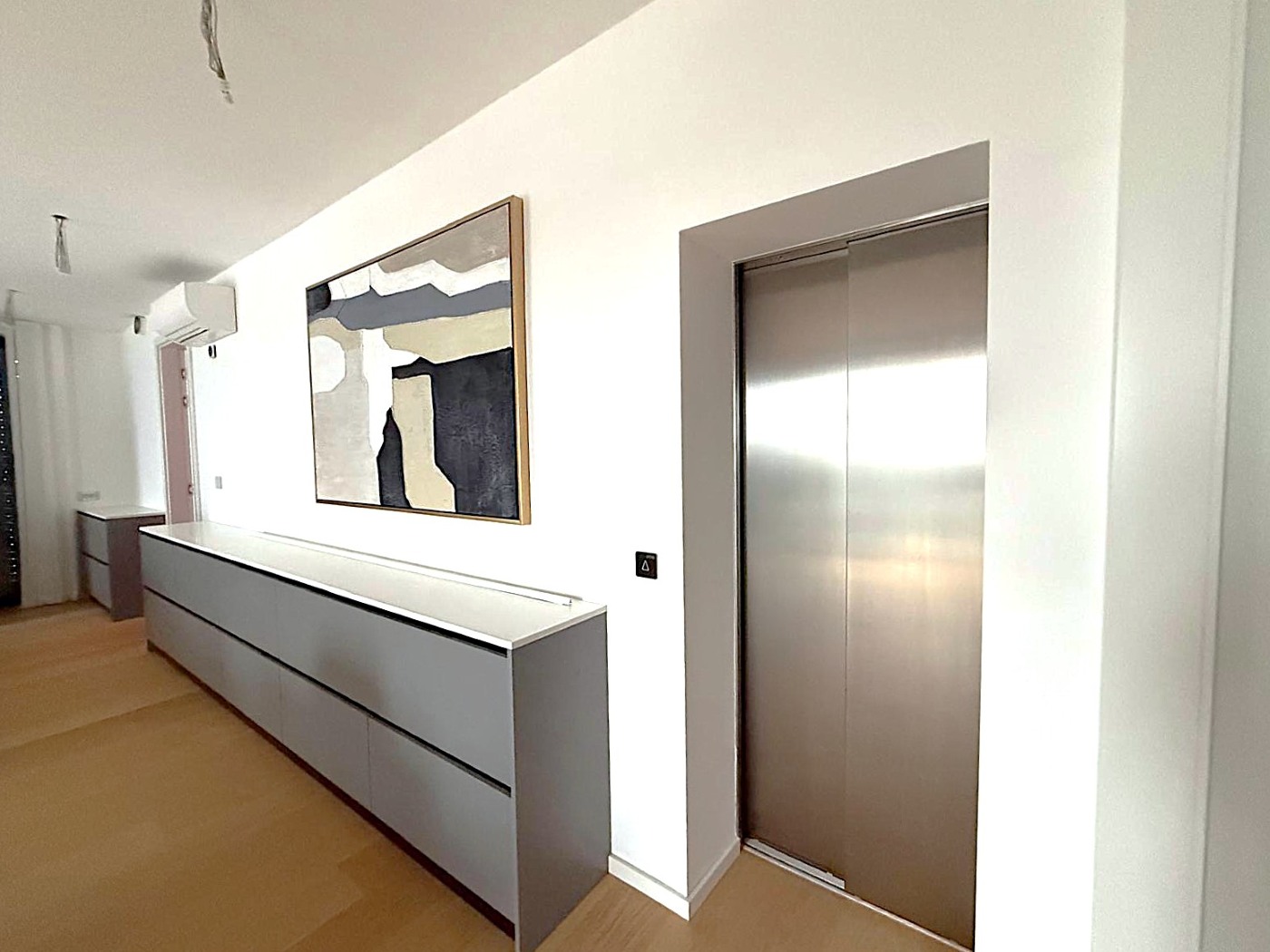The duplex layout creates a natural separation between living and private areas, while expansive terraces open to panoramic views of Ljubljana Castle and the Alps.