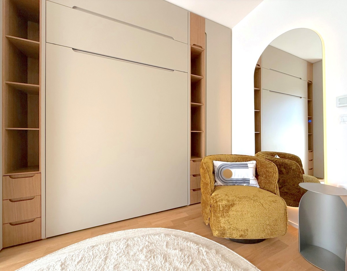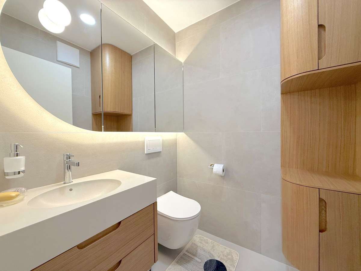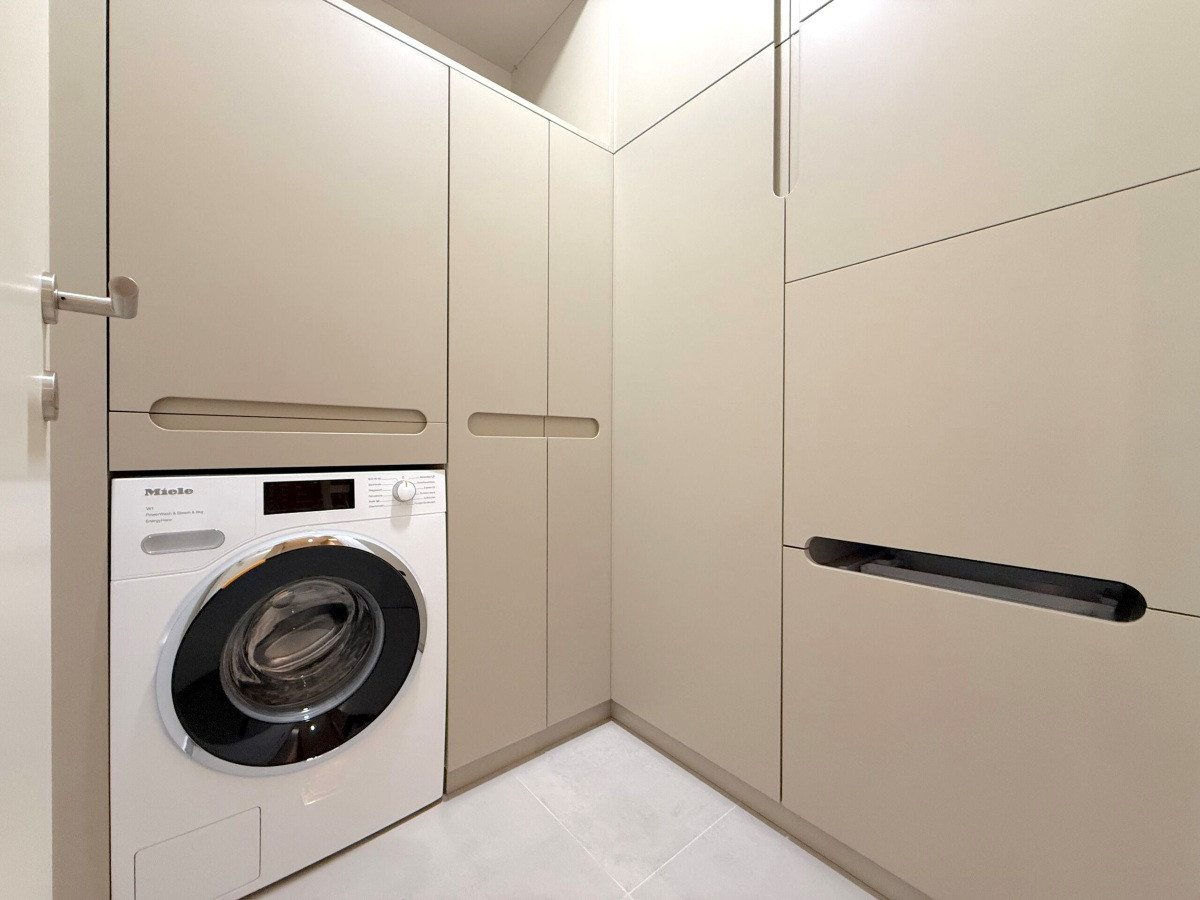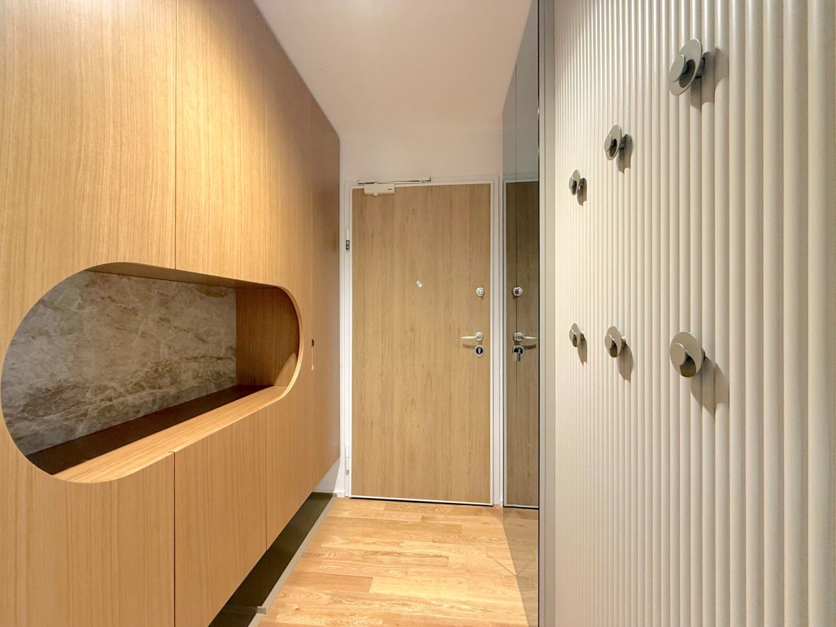 The apartment is rented fully furnished and features high-end appliances and furniture.