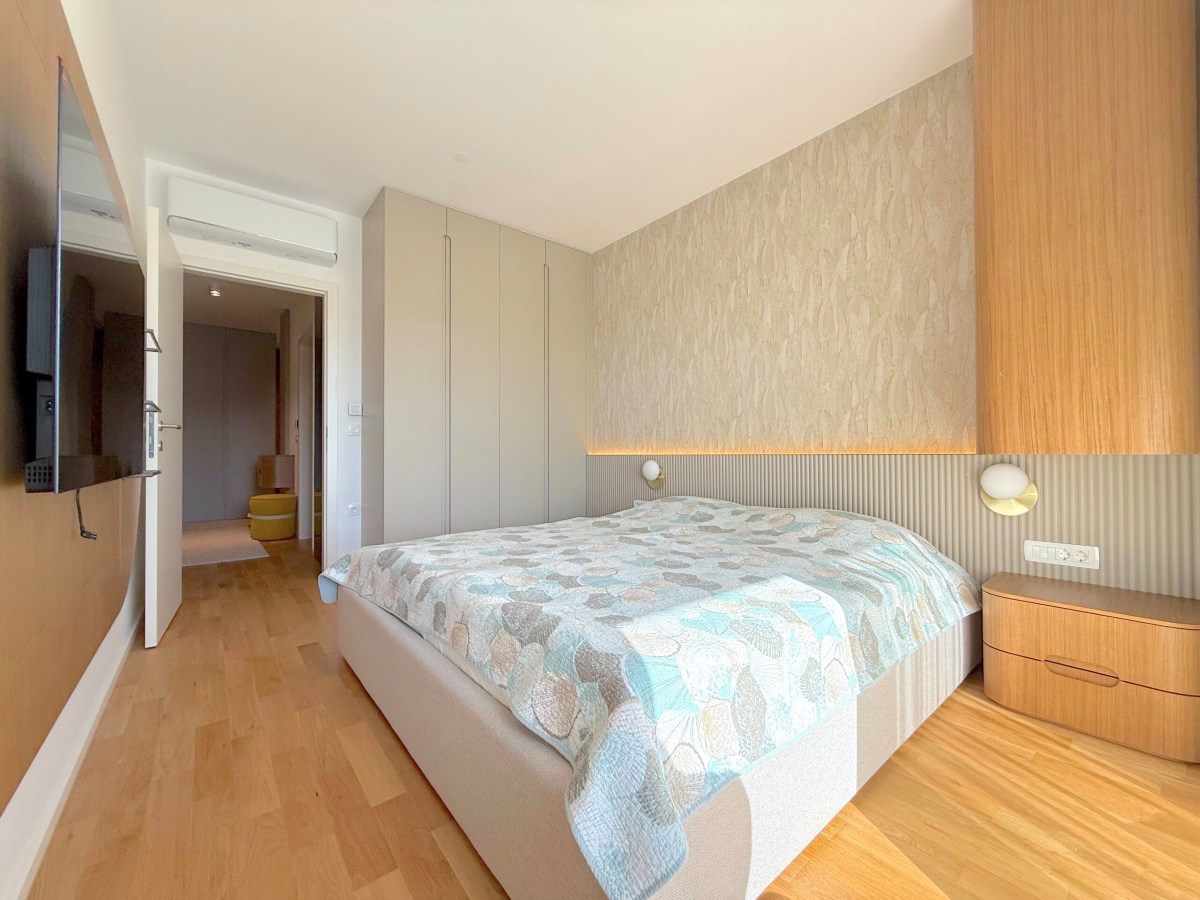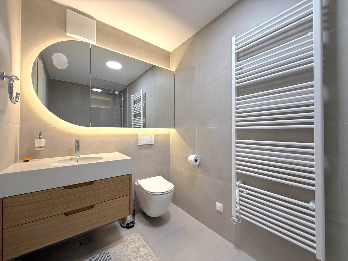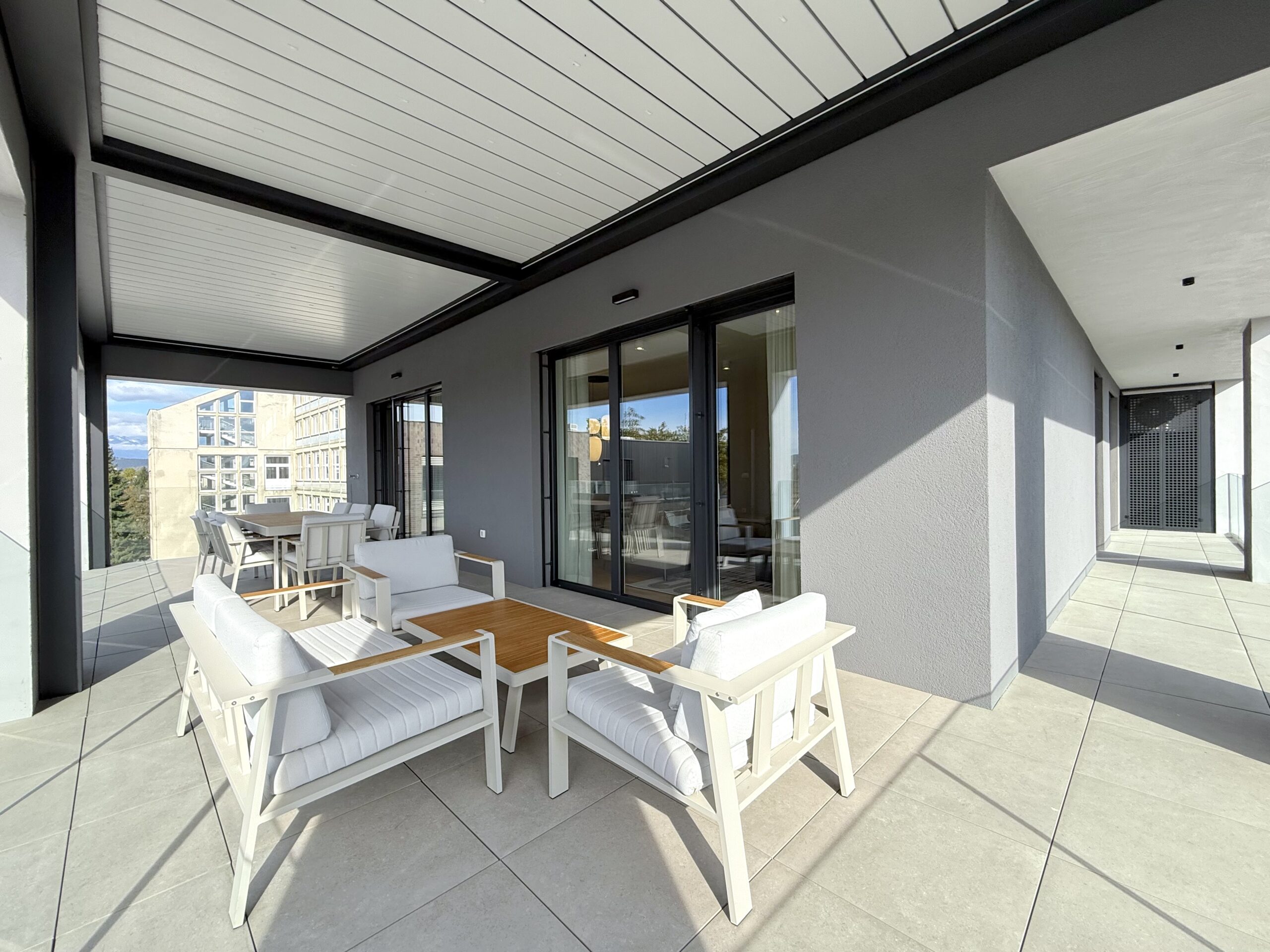 The living room, kitchen, and both bedrooms have access to a spacious terrace. The terrace is equipped with a Ralux bioclimatic pergola.