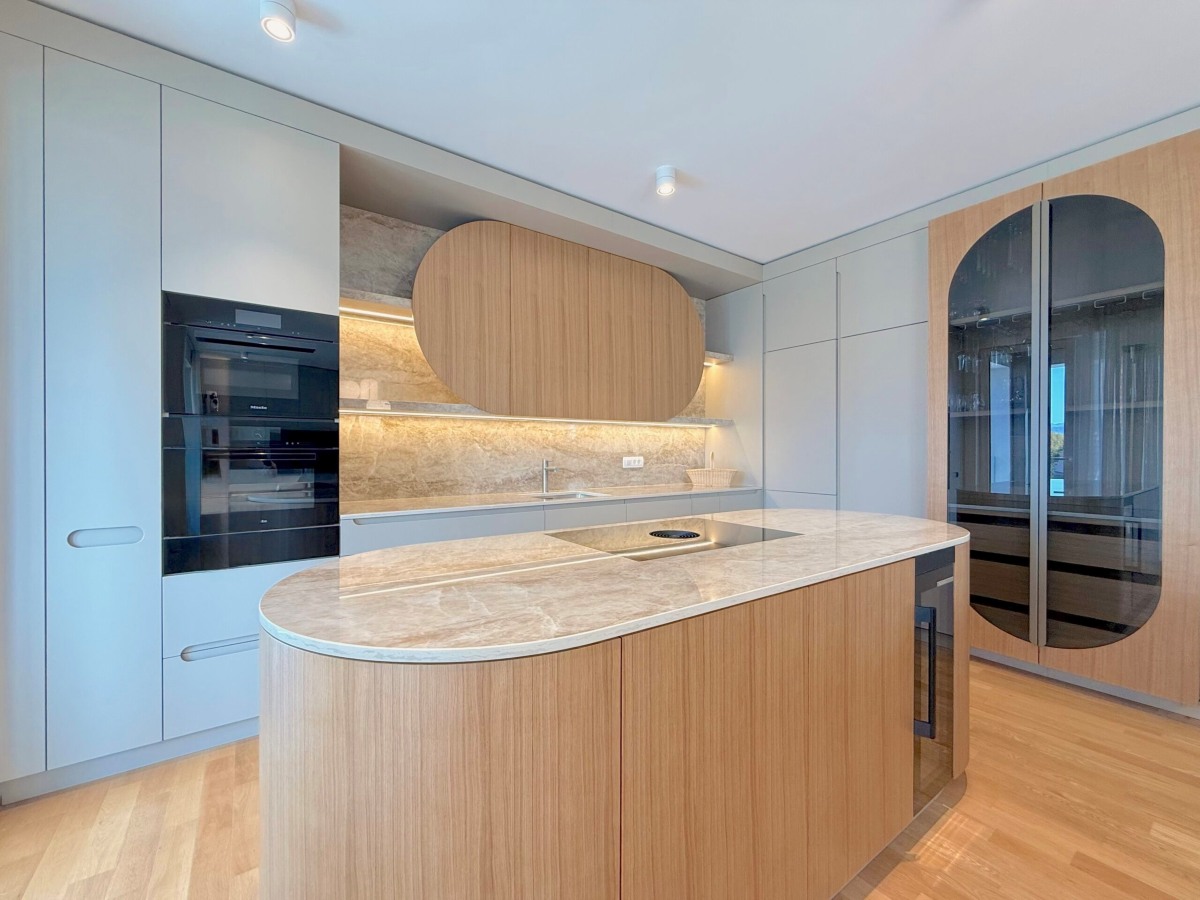 The kitchen features Miele appliances, a Bora cooktop with integrated hood, a Liebherr refrigerator, and a Bosch wine cellar. The interior features a Natuzzi sofa, Calligaris chairs, and polished marble countertops and trim.