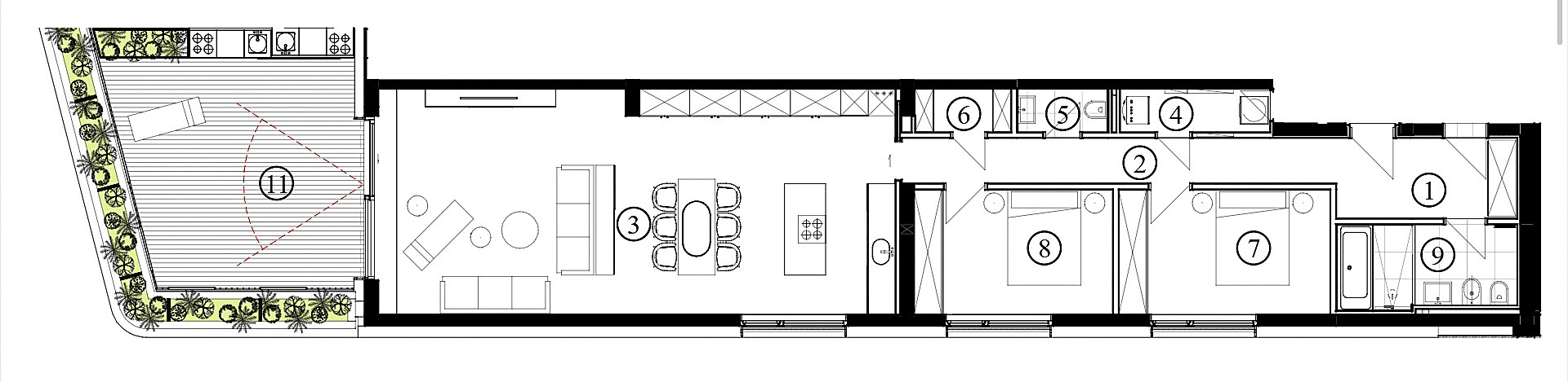 Резиденция включает 6 уровней и 7 отдельных апартаментов с открытыми террасами и видом на море и подземный этаж.