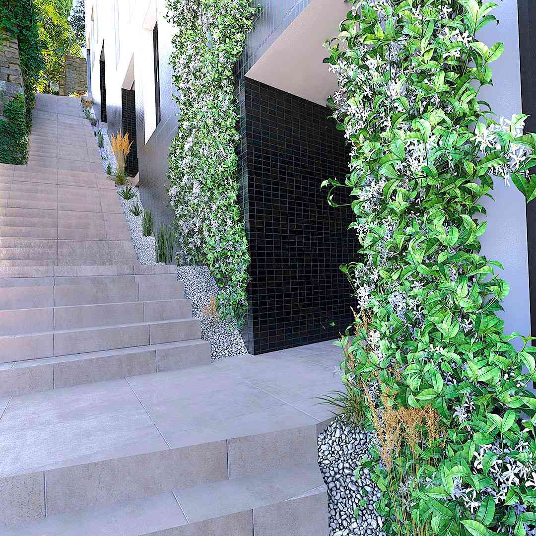 Лифт соединяет все уровни резиденции. Несколько входов обеспечивают удобство и приватность. Зеленые террасы формируют собственные наружные зоны и создают естественный экран от дороги.